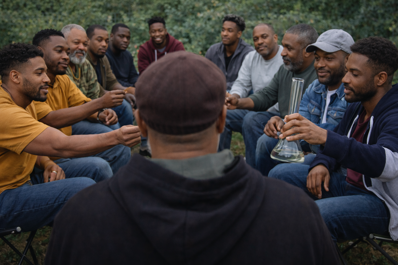 A somatic, culturally resonant healing space for Black and Brown men. Cannabis is treated as an ally for presence, not an escape.